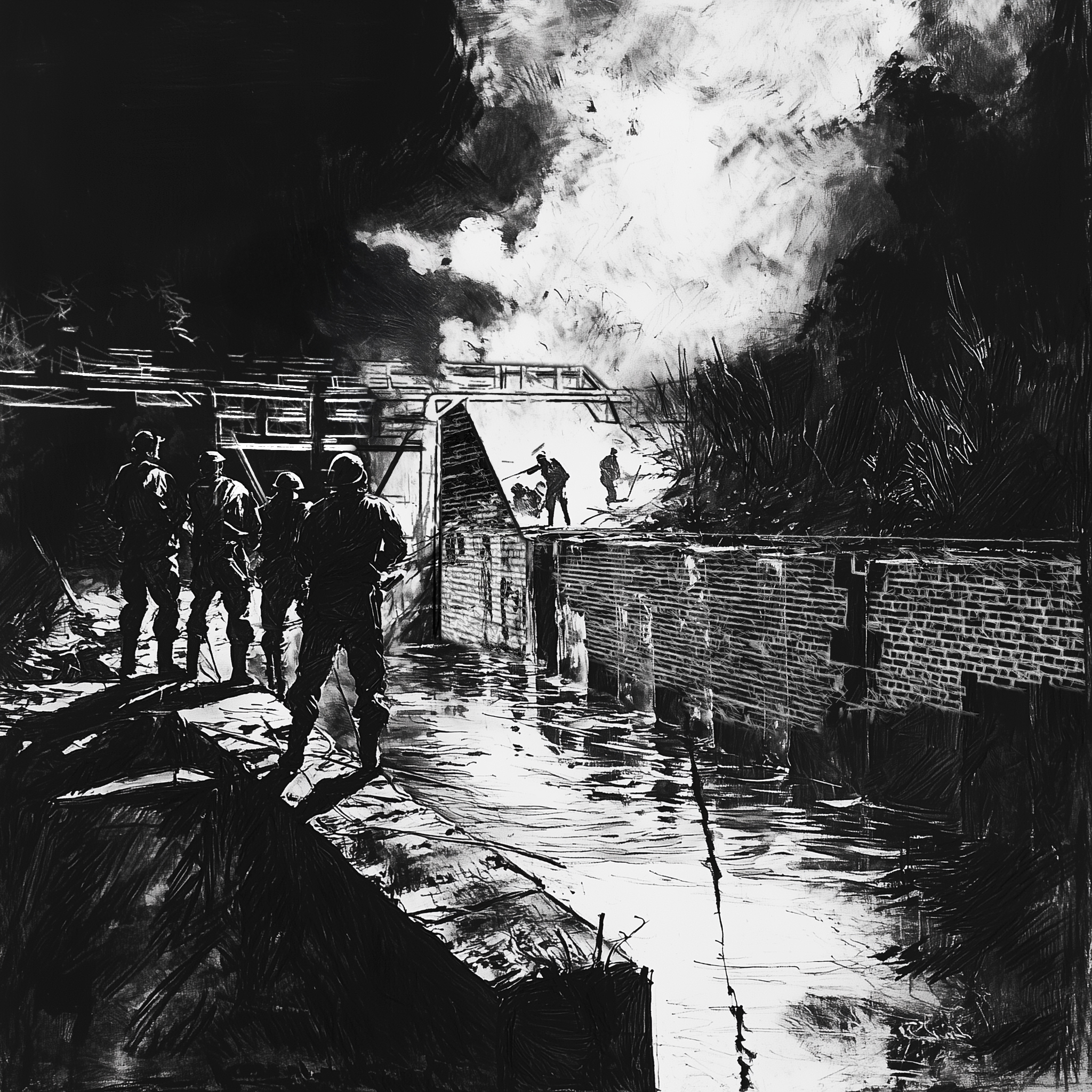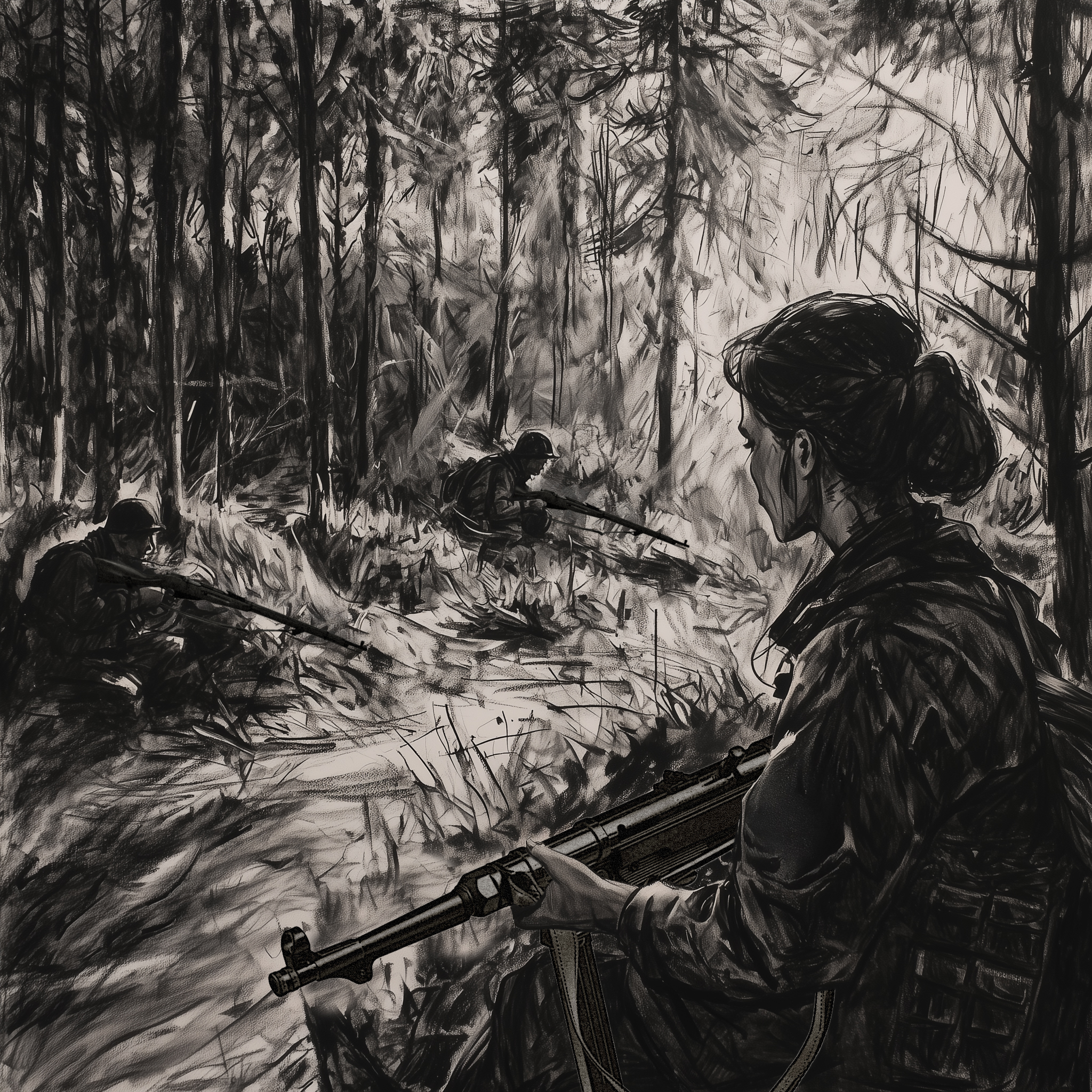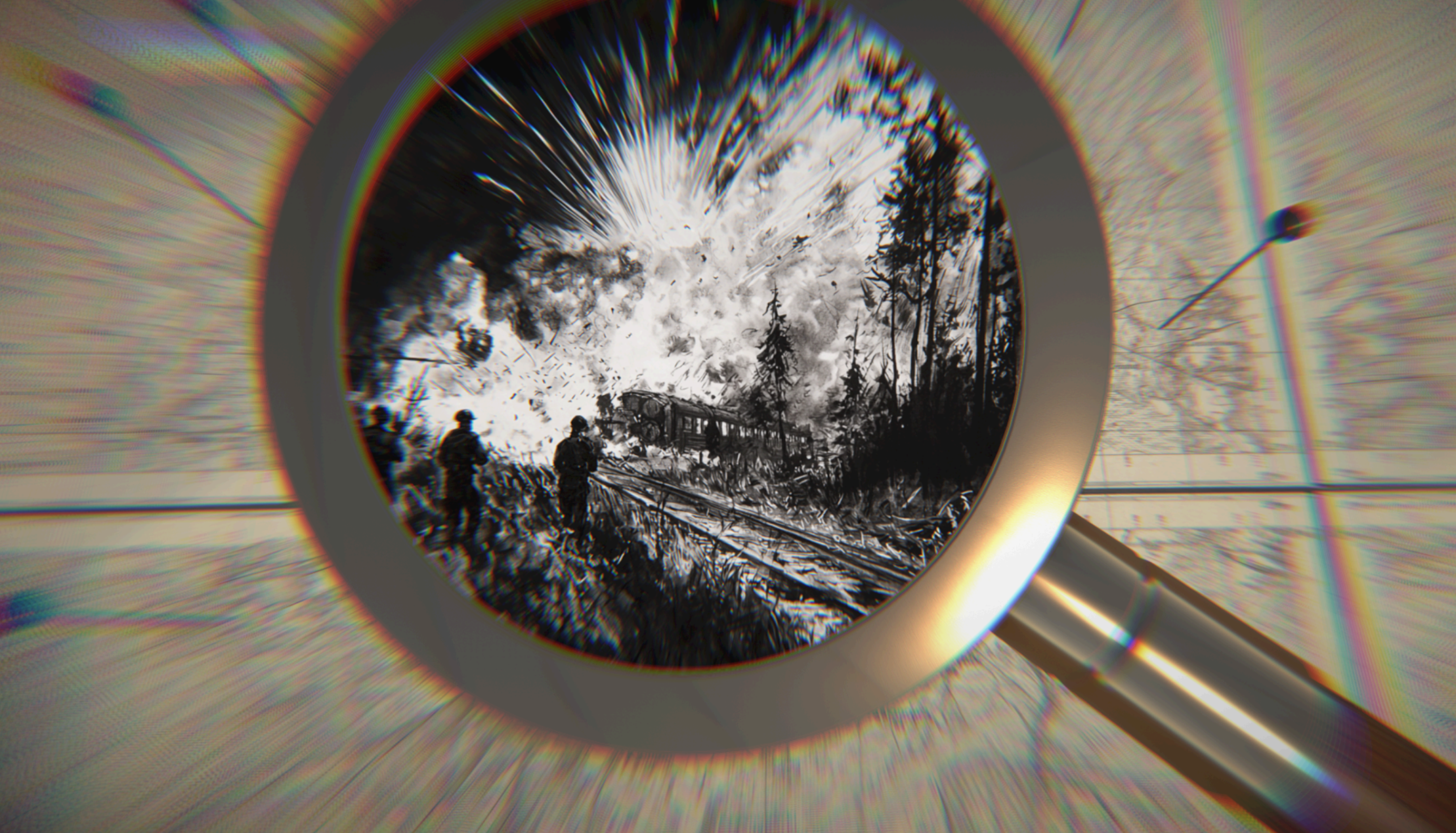 Zwiedzający przesuwa lupę po panelu sterowania, a na wielkiej mapie kamera podąża za jego ruchem, przybliżając kolejne lokalizacje. Przy każdym punkcie pojawia się szkic wydarzenia — nie fotografia, nie render. lecz odręczny rysunek,szkic. Całość utrzymana jest w formie wspomnień anonimowego oficera siedzącego przy mapie sztabowej - nie wiemy, po której jest stronie, nie wiemy, czy jest świadkiem czy uczestnikiem. Wiemy tylko, że pamięta.