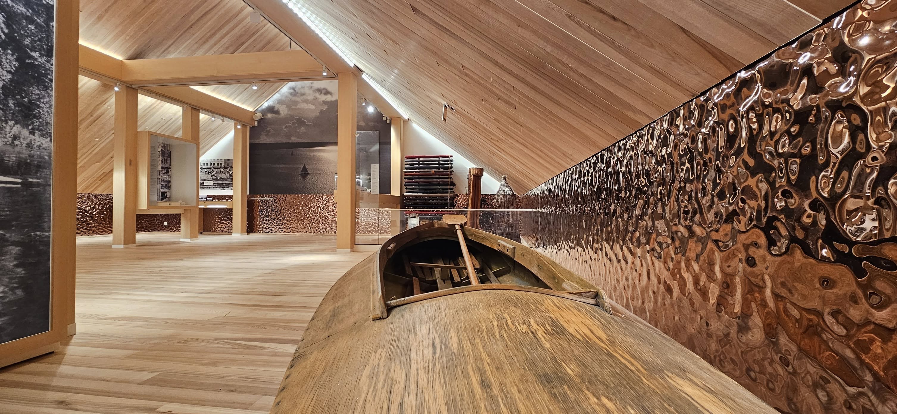 Na poddaszu, w strefie edukacyjnej, zmieniliśmy ton. Wystawa skierowana jest również do młodzieży - i wiedzieliśmy, że po godzinie w salach pełnych świadectw zbrodni potrzebne jest coś innego. Zaprojektowaliśmy strefę w konwencji namiotu w puszczy - z grami edukacyjnymi, które uczą historii regionu bez patosu, ale z szacunkiem.