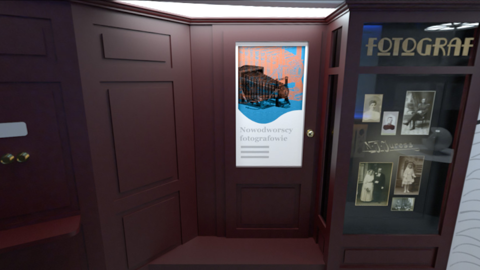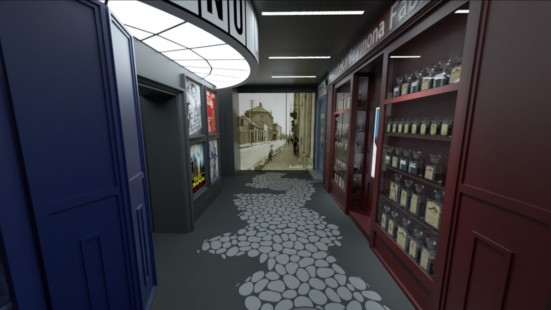 Centralnym zabiegiem scenograficznym jest stylizowana uliczka z dwudziestolecia międzywojennego - szczytu rozkwitu i różnorodności Nowego Dworu. Dekoracyjne elewacje drewnianych budynków, witryny sklepowe, szyldy. A za witrynami - stanowiska interaktywne: wnętrza zakładów rzemieślniczych z panoramą 180° reagującą na ruch zwiedzającego, apteka Szymona Fabiana z przepisami na ziołowe mikstury do zabrania na telefon, fotoplastikon z anegdotami z życia miasta sporządzone dzięki uprzejmości Marii Możdżyńskiej na podstawie jej książki „(Nie) Legendy nowodworskie”. Wielkoformatowa projekcja wita gości, anonsując czego się dowiemy na wystawie jednocześnie przedłużając i ożywiając wizualnie ulicę zaprasza na dalszy spacer.