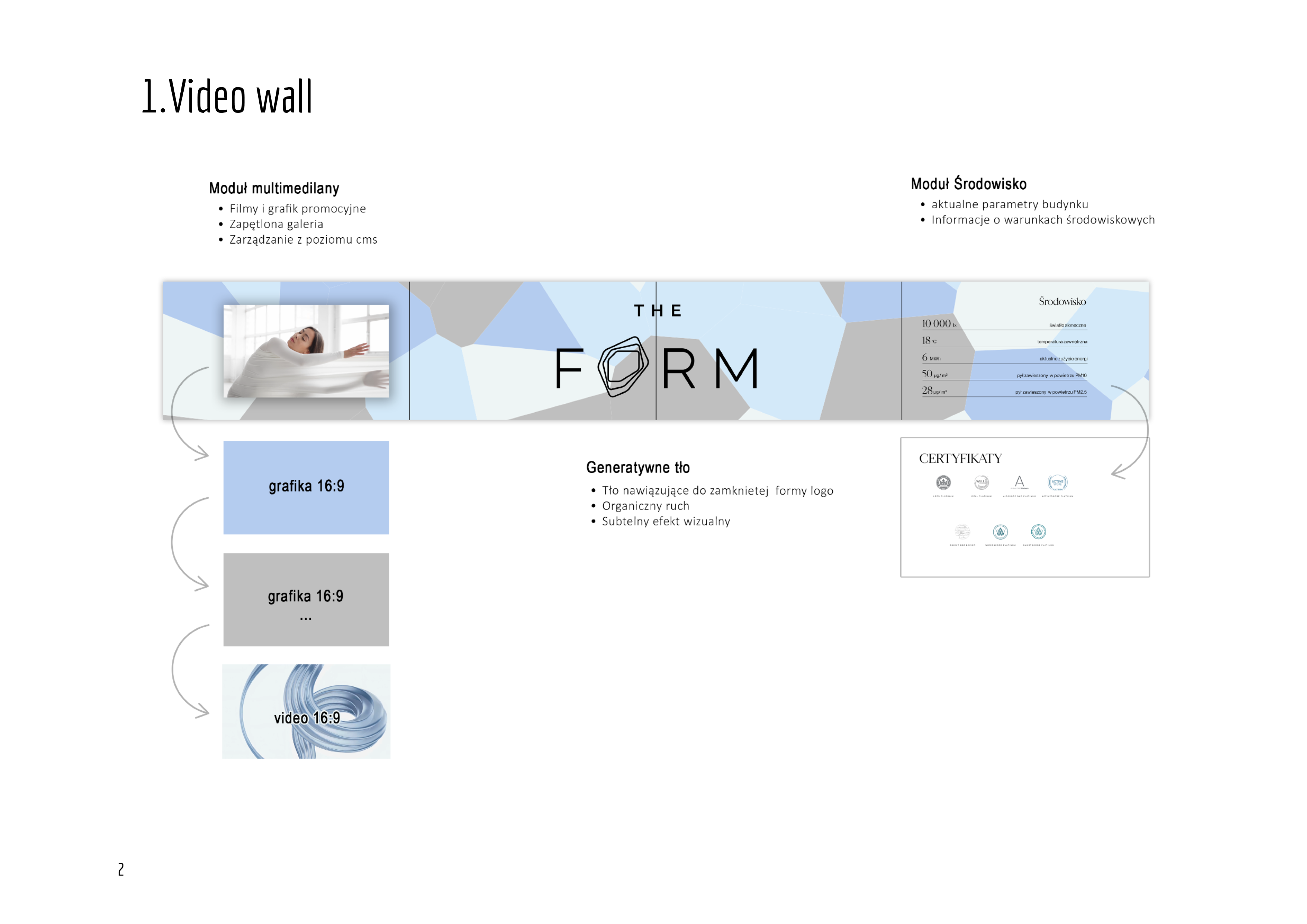 Do tego warstwa informacyjna: aktualności budynku, komunikaty zarządcy, wydarzenia w okolicy, pogoda, kalendarz sal konferencyjnych. Wszystko zaprojektowane tak, żeby wyglądało jak element architektury, nie jak naklejony ekran. Typografia, kolorystyka, rytm animacji - dopasowane do identyfikacji wizualnej The Form.